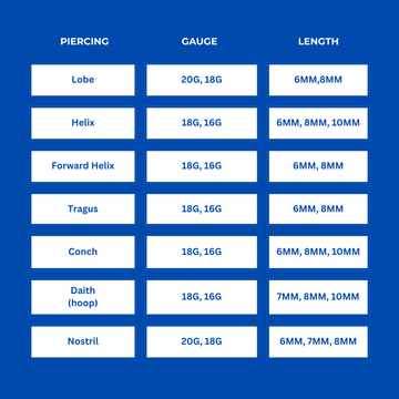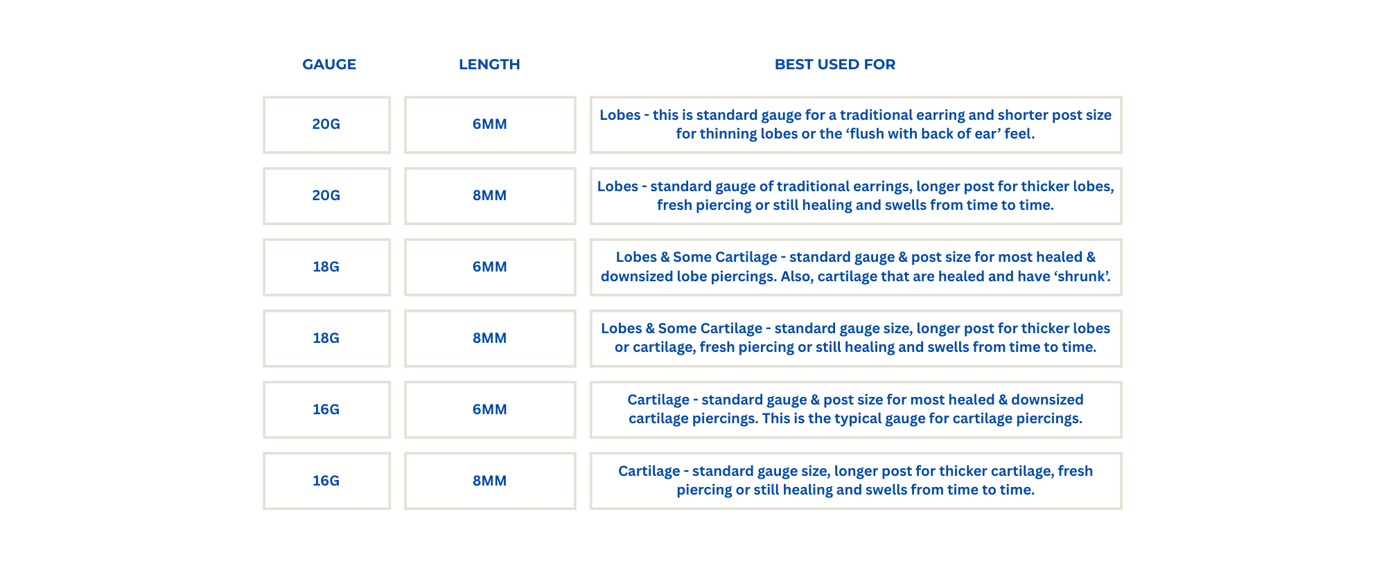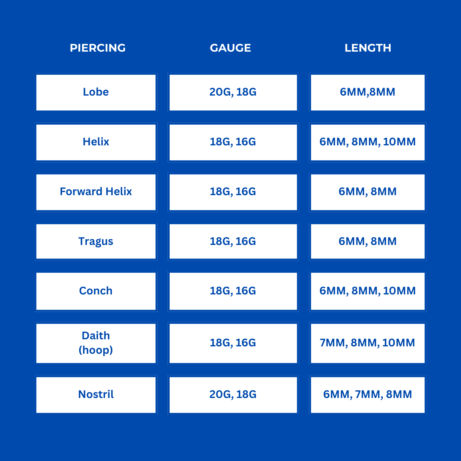 - Gauge (G): How thick the post is. Most healed lobes are 20G, while cartilage and professional piercings are typically 16G–18G. The bigger the gauge number, the thinner the post.