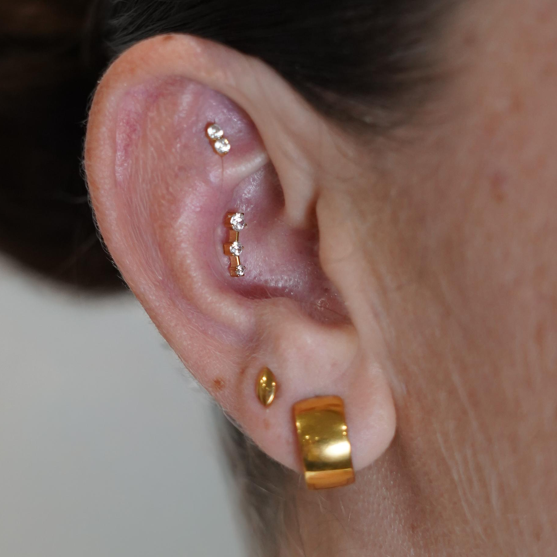 Add a touch of shine with these Flat Marquis Stud earrings. Their sleek, marquis shape offers a chic and modern look that's perfect for brightening up any ear stack. Small but eye-catching, they're your go-to for a playful pop of shine wherever you go. We love the flat marquis in a lobe, helix, conch or tragus -- but it effortlessly fits well all throughout the ear!