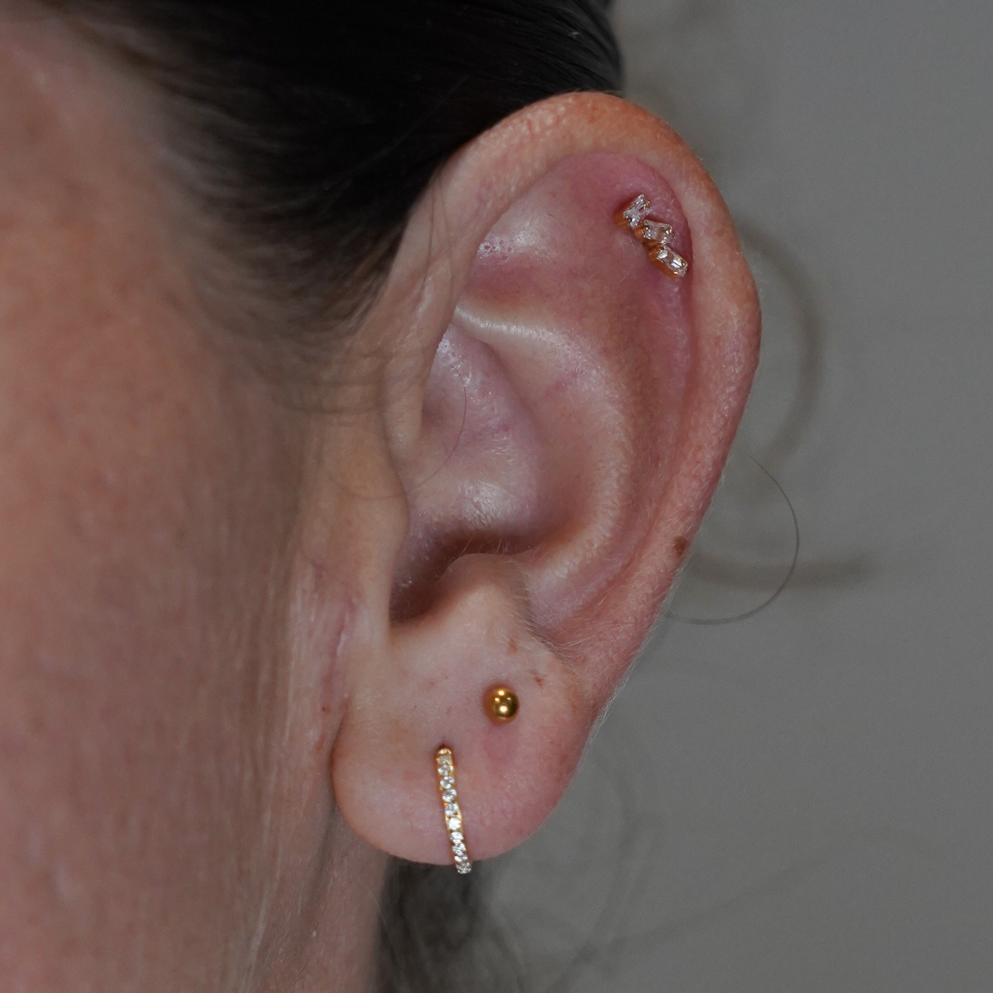 The Mini Baguette Fan is a stunning arch earring designed for flat or helix piercings. Featuring elegant baguette-cut stones arranged in a fan pattern, this piece delivers sophisticated sparkle in a compact size. Our team is obsessed with how beautifully it catches the light and the way it complements any ear shape. A versatile essential that elevates your piercing collection with understated glamour.